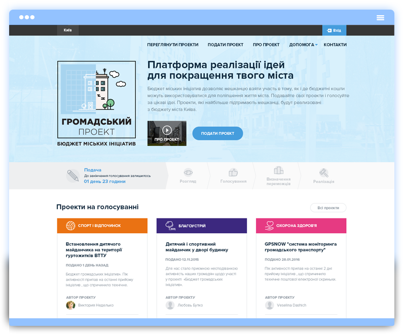 Платформа «Громадський проект» дозволить вам брати участь в конкурсі, не виходячи з дому: ви можете подати заявку on-line і відслідковувати долю свого проєкту прямо на сайті."